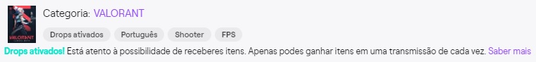 - Vê streams que têm os drops ativos! Isto é um passo muito importante pois apenas Streams assinaladas poderão dar-te uma chance de obter o acesso! Tens acesso a essa informação por baixo da categoria da stream.